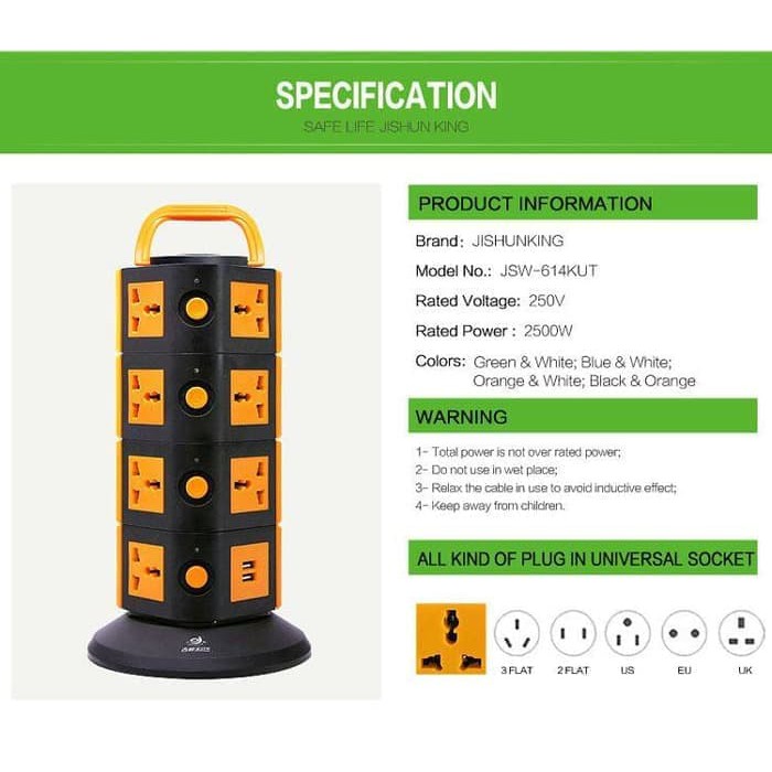 Vertical Multi Function Secure Socket 4 layer with 15 plug and 2 USB adalah sebuah alat yang berfungsi untuk menghubungkan alat-alat elektronik ke sumber listrik yang memiliki bentuk plug yang berbeda, misalnya pada saat Anda di rumah, di kantor atau traveling. Alat ini memiliki 15 plug dan 2 USB Hub. Alat ini dapat digunakan untuk notebook dan smartphone ataupun alat elektronik lainnya.Vertical Multi Function Secure Socket 4 layer with 15 plug and 2 USB dengan 15 colokan universal dilengkapi 2 USB bisa untuk men-charge iPad, HP, BB, Camera dan lain-lain. Posisi vertical, hemat space, bisa ditaruh di atas meja. Dilengkapi dengan lampu LED dan tombol on/off di setiap layer (hemat listrik).Specifics :Rated Current : 10AApplication : Residential / General-PurposeGrounding : Standard GroundingModel Number : JSW-614KUTType : Extension SocketSocket Type : USB tower socketRated Power : 2200WOutlet Number : 15 outlets + 2 usb portsUSB Current : 2100mAColor : Orange, Blue, Green, Black OrangeOverload protector : YesCable length : 1.8mPlug type : EU/UK/US/AU plugDescription : Smart USB Socket 220V 10A Universal Type Standard Multi Power SocketRated Voltage : 250V barang tersedia boss , langsung dipesan , akan segera kami p