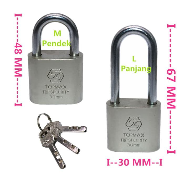 Gembok 30mm 3 KunciSpesifikasi opsionalL - Panjang- Lebar bodi = 30mm- Tinggi bodi = 68mm- Tebal bodi = 15mmM - Pendek- Lebar bodi = 30mm- Tinggi bodi = 48mm- Tebal bodi = 15mm- Bahan besi- Kunci 3 buahGembok ini terbuat dari bahan berkualitas, cocok digunakan di rumah atau pun kantor untuk menjaga keamanan
