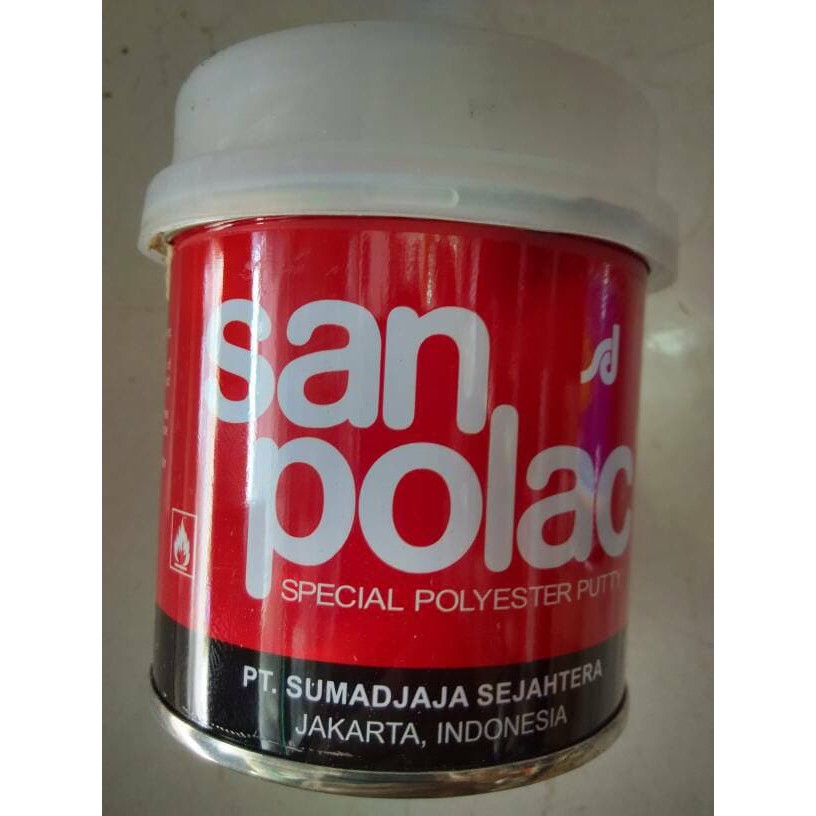Ready Stok pengiriman Jabodetabek saja via Grab atau Gojek....San Polac adalah polymer atau sering disebut dempul plastik. Gunanya untuk mengisi atau membentuk. San Polac menggunakan hardener (resin). Setiap pembelian San Polac mendapat resin. Dempul San Polac agak keras dan cepat kering, susah untuk finishing yang halus.Cara Pemakaian1.Hilangkan cat lama,karat,sisa kerak oli,abu,air dll.sampai bersih benar.2.Aduklah dempul dengan hardener sampai rata(perbandingan standar antara dempul dan hardener adalah 100:2 menurut berat)3.Gunakan adukan dengan kape dalam waktu pot life(waktu potlife adalah 5-7 menit pada suhu 30 derajat celcius dan dapat berubah tergantung pada suhu dan kelembaban nisbi)4.pengampelasan dapat dilakukan setelah kering(setelah satu jam pada suhu 30 derajat cel