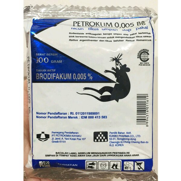 RACUN TIKUS PETROKUM MATI KERING ANTI BAUMinimal order 2pcsRodentisida antikoagulan berupa umpan siap pakai berbentuk blok warna hijaukebiru- biruan mengendalikan hama tikus di Rumah dan Kebun Anda.Tikus mati kering dan atau mencari cahaya setelah 2-3 hari makan umpan siappakai ini, jadi tidak berbau..CARA PENGGUNAAN :. Letakkan 3-5 potong umpan Racun tikus ditempat yg sering dilalui tikus ( tidakusah campur dgn makanan). Usahakan tidak ada makanan lain disekitar umpan.. Gunakan sarung tangan plastik atau kantong kresek saat memotong & memasangu