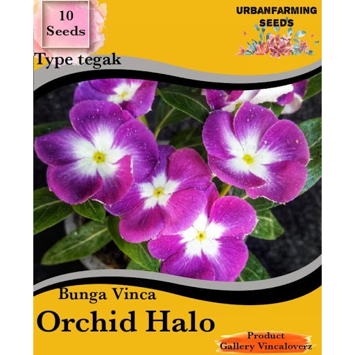 Vinca Orchid Halo merupakan jenis bunga vinca yang menghasilkan bunga berukuran kecil. Bunganya terdiri dari 5 kelopak bunga yang tersusun membentuk lingkaran penuh, berwarna ungu dengan halo berwarna putih dan titik kuning pada bagian pusatnya. Kontras dengan daunnya yang berbentuk oval dan berwarna hijau mengkilap.Sesuai namanya, varian bunga vinca ini memiliki pertumbuhan yang tegak, berakar kuat dan percabangan yang baik. Tinggi tanamannya sekitar 25-30 cm dan lebar sekitar 15-20 cm. Sangat cocok dijadikan sebagai hiasan taman dan tanaman pembatas. Dapat tumbuh dengan baik di daerah dataran rendah hingga tinggi, toleran terhadap cuaca dan penyakit, serta memiliki siklus hidup setahun atau lebih tergantung dari perawatannya. Kebutuhan airnya rendah dan sangat menyukai sinar matahari. Sebaiknya lakukan pemangkasan dan pemupukan guna mendukung pertumbuhan tunas-tunas baru dan memperpanjang usia tanaman.Isi: 10 biji per kemasan