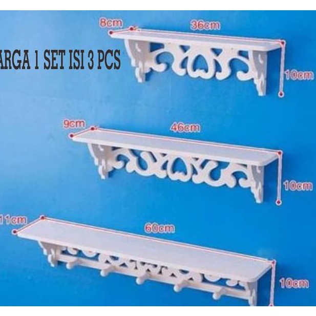HARGA 1 SET ISI 3 PCSTIDAK TERMASUK PAJANGANRak dinding vintage 1set isi 3pcs (New ada 5 hook gantungan)Brand : KINBARReady warna putihMaterial : WPCUkuran : 60cm x 10cm x 11cm46cm x 10cm x 9cm36cm x 10cm x 8cmProduk berkualitas buatan Mesin, bukan produk buatan tangan sehingga terjamin akurasi dan juga furnishing yang jauh lebih rapi sehingga membuat ruangan rumah anda lebih indah terlihat. apa itu wpc? Wpc adalah kepanjangan dari wood plastic composite, yang secara bahasa dapat diartikan komposit kayu-plastik. Composite bisa diartikan campuran, jadi wpc adalah campuran antara kayu dan plastik. Sebuah material baru yang tersusun dari elemen kayu dan plastik yang dilebur menjadi satu dan membentuk sebuah material baru, wpc. Bahan anti air, tidak gampang terbakar, mudah dibersihkan.Harga Di Atas 1 Set Isi 3 PcsBerat Satuan: 1000 GramKode :