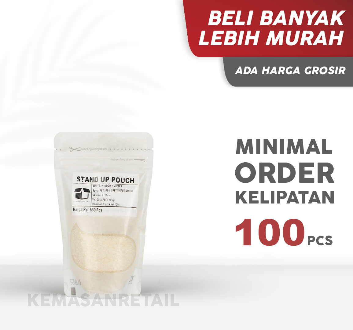 MOHON DI PERHATIKAN: - Minimum order: Kelipatan 100 pcs (1 pack)- Barang yang sudah di beli tidak dapat di kembalikan atau ditukar. - Mohon pastikan terlebih dahulu ukuran yang anda pilih.Spesifikasi Produk:Jenis = Stand Up Pouch / Standing PouchFasilitas: Zipper dan tear notch.Isi = 100 pcs/packSpec: Depan OPP/LLDPE Furec (85 µ) , Belakang: OPP/VPOPP/LLDPE Furec (105 µ)Food Grade materials.Tersedia berbagai jenis ukuran:- 9cm x 15cm (untuk acuan gula pasir 150g, acuan kopi 70g)- 13cm x 20cm (untuk acuan gula pasir 250g, acuan kopi 150g)- 14cm x 23cm (untuk acuan gula pasir 500g, acuan kopi 250g)- 18cm x 29cm (untuk acuan gula pasir 1100g, acuan kopi 600g)Kemasan Stand Up Pouch Window merupakan kemasan yang dapat berdiri dan terbuatdari bahan plastik di bagian depannya dan metalis untuk bagian belakangnya. Kemasan ini memiliki dua jenis motif jendela dan warna kemasan, Jendela bermotifsplash (untuk warna Hitam) dan motif Daun (untuk warna putih). Ada tulisan “sobek disini” dibagian atas zipper, juga disertai “tear notch”segitiga kecil utk sobekan. Produk ini tidak murahan, melindungi produk andadari Kelembaban, Udara dan Benturan.Stand Up Pouch Window ini sangat cocok untuk produk seperti keripik, kacang,snack, biji-bijian, bubuk, serbuk, produk fashion juga aksesoris. Walaupun bisadipakai utk mengemas cairan/pasta, akan tetapi tetap tidak kami sarankan. Jendela transparant di bagian depan menjadi daya tarik tersendiri sehinggaorang-orang bisa melihat produk anda dengan jelas.Kami juga menerima JASA PENGEMASAN (Co-Packer), didukung dengan mesin-mesinautomatic berkualitas terbaik dikelasnya.Terima kasih telah berbelanja di toko kami. ^^ Just DO IT & DO the Bes