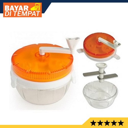 Twisting Vegetable Chopper Murah | Alat cincang Bawang Dan Sayuran Ekonomisadalah alat unik untuk membantu pekerjaan dapur Anda mencincang dan memotongsayuran!Mencincang bawang, bawang putih, tomat, membuat salad, makanan bayi dll jadilebih mudah, praktis dan tidak mengotori tangan!Twisting Vegetable Chopper ini memiliki handle diatas untuk menggiling dan tigabuah pisau stainless steel untuk mencincang.Bisa untuk mencincang halus dan kasar. Putar handle jangan terlalu lama bilaingin hasil cincang kasar. Dan putar handle lebih lama untuk hasil cincang yglebih h